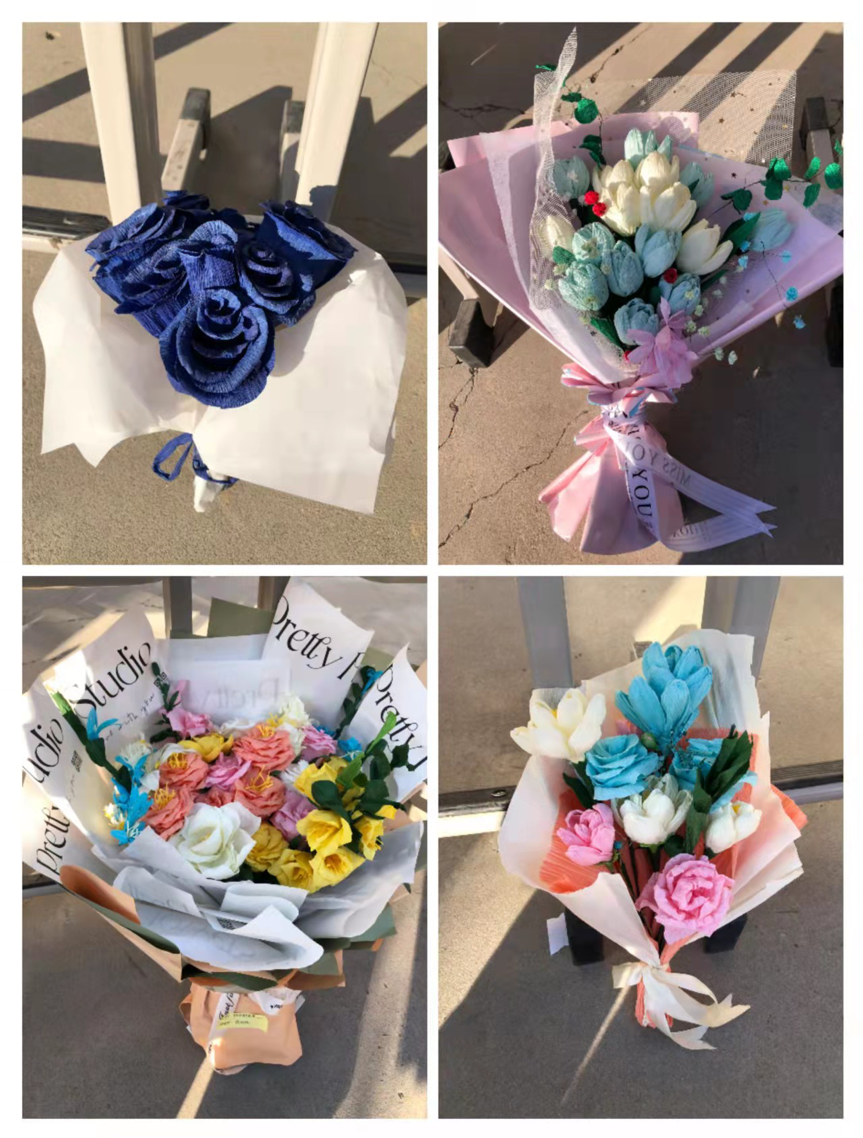 鲜花会凋零,但皱纹纸花束不会。育中学子利用皱纹纸制作出一朵朵精美的纸花,为我们打开了一扇美和生动永存的大门。